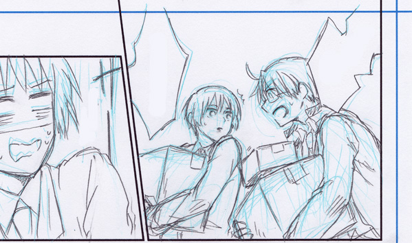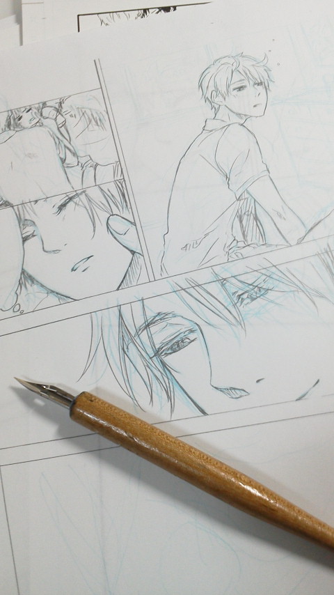 人物と直線を使わない背景はアナログ、背景とトーンはデジタルで進行します。